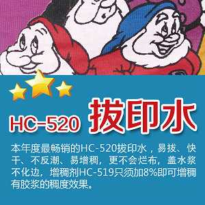 本年度最暢銷的HC-520拔印水 ,也是印花行業(yè)所說的臺面拔印白漿,臺面彩拔漿和臺面拔印漿等稱號,520拔印水具有易拔、快干、不反潮、易增稠,更不會爛布、蓋水漿不化邊,增稠只需加 8%1 即可增稠有膠漿的稠度效果,是做拔印、彩拔效果的最佳首選材料。