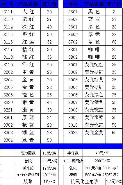 增牢助劑 /多功能助劑 /增稠劑 /粘網(wǎng)膠 /固色劑 /絲印油墨 /印花輔料 /防塞網(wǎng)劑 /A+B硬膜劑 /油性臺(tái)板膠 /洗水助劑 /更多+發(fā)光變色顏料 >>