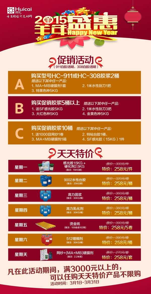 廣州輝彩特殊印花材料公司在羊年為回饋廣大新老客戶,在2015年開(kāi)年的03月01日至3月31日這段時(shí)間,印花材料將天天特價(jià)回饋新老客戶,這次活動(dòng)才剛剛開(kāi)始就得到了不少客戶的高度贊譽(yù),同時(shí)為輝彩印花材料在這印花行業(yè)內(nèi)的名聲也大為廣傳,并高度認(rèn)可了輝彩印花材料產(chǎn)品的質(zhì)量,為感謝新老客戶的高度支持,輝彩印花材料以后會(huì)推出更多實(shí)惠高品質(zhì)的產(chǎn)品。關(guān)注更多的優(yōu)惠活動(dòng),請(qǐng)關(guān)注輝彩微信公眾號(hào):hchg168;或登錄輝彩官網(wǎng):hchg168.com;