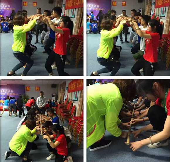 上圖為同心桿游戲體驗,   通過游戲體驗,鍛煉團隊的協(xié)作、用心、專注、同心的能力,自認(rèn)為5分鐘就可以完成游戲的團隊,20分鐘之后卻只有一個小組完成