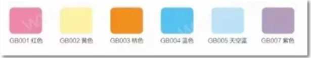GB001紅色、GB002黃色、GB003桔色、GB004藍色、GB005天空藍、GB007紫色標準六色。