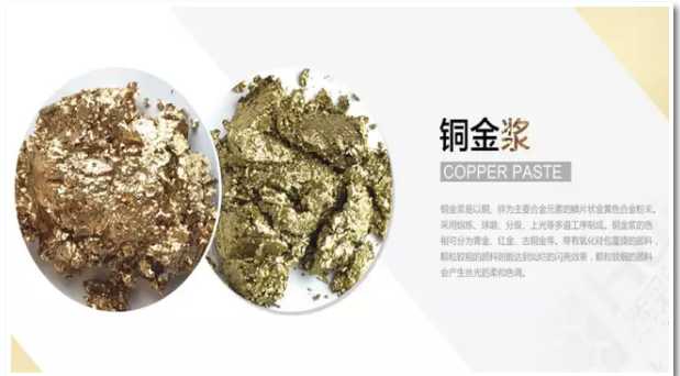 銅金漿是以銅、鋅為主要合金元素的鱗片狀金黃色合金粉末。采用熔煉、球磨、分級、上光等多道工序制成。銅金漿的色相可分為青金、紅金、古銅金等。帶有氧化硅包覆膜的顏料,顆粒較粗的顏料則能達(dá)到燦爛的閃亮效果,顆粒較細(xì)的顏料會產(chǎn)生絲光的柔和色調(diào)。