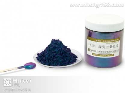 8190綠變蘭紫紅金變色龍粉其變色原理為吸收特定波長之紫外光源,藉由該光源之能量而產(chǎn)生顏色變化(變?yōu)樽仙?、紅色、黃色、天空蘭色),當(dāng)特定波長的紫外光源不在時,即回復(fù)原來的顏色。