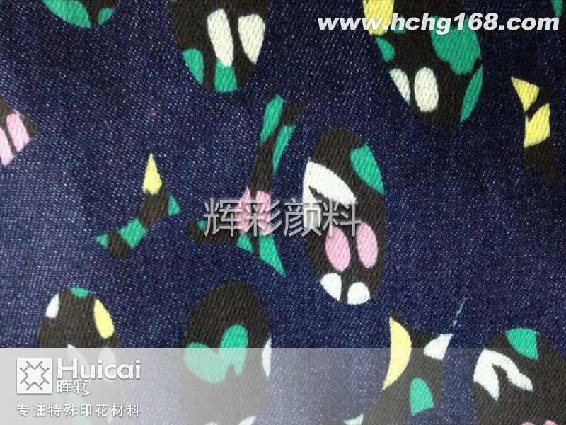 為解決拔白漿拔不白的難題,一般在靛蘭牛仔坯布上常規(guī)網(wǎng)印或機印拔染出花紋、圖案,經(jīng)烘干、水洗、烘干,制得藍底帶花的印花牛仔布;或在水洗工序后經(jīng)過固色劑水溶液處理,再水洗至中性、烘干,制得藍底白花的印花牛仔布。