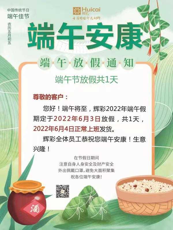 端午節(jié)是我國的傳統(tǒng)節(jié)日,為每年農(nóng)歷五月初五,根據(jù)國務(wù)院辦公廳關(guān)于端午節(jié)放假通知,并結(jié)合我司實(shí)際情況,廣州輝彩印花材料有限公司2022年端午節(jié)放假時間為6月3日(星期五),6月4號(星期六)正常上班。